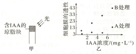 实验2:将生长两周的番茄幼苗叶片分别进行A、B两种处理(A处理:不同浓度的IAA溶液处理;B处理:在不同浓度的IAA溶液中分别加入适宜浓度的乙烯处理),3h后测定细胞膜的透性,结果如图乙所示。回答下列问题: