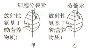 3. (2025·东北育才中学)为探究细胞分裂素延缓衰老的原因,研究人员设计了如下实验:在烟草叶片A处涂抹放射性的营养物质氨基丁酸,B处分别涂抹一定量的细胞分裂素和蒸馏水,一段时间后,发现甲组B处呈现强烈的放射性,而乙组B处却没有放射性。结合所学知识,下列叙述错误的是(