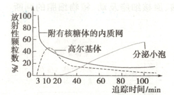 (1)科学家将一小块胰腺组织放入含放射性标记的氨基酸培养液中短暂培养,在此期间放射性标记物被活细胞摄取,并掺入正在合成的蛋白质中。然后,科学家立即洗去放射性标记物,转入不含放射性标记物的培养液中继续培养。实验结果如图所示。随着追踪时间的变化,放射性颗粒数的百分比在不同细胞结构上有规律的变化,据此推测,分泌蛋白转移的途径是附有核糖体的内质网→高尔基体→分泌小泡。