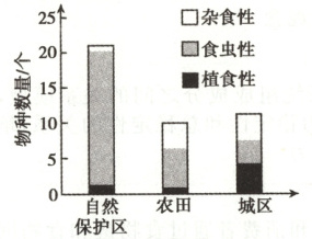 [例] (2024·广东卷)为探究人类活动对鸟类食性及物种多样性的影响,研究者调查了某地的自然保护区、农田和城区$3$种生境中雀形目鸟类的物种数量(取样的方法和条件一致),结果见图。下列分析错误的是(