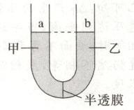 3. (2025·河南名校联考)如图为一个渗透装置,假设溶质分子或离子不能通过半透膜,实验开始时,液面$a$和$b$平齐。下列判断错误的是(