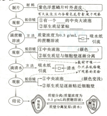 结论:细胞液$\xrightarrow[质壁分离复原(清水)]{0.3g/mL的蔗糖溶液}$细胞液