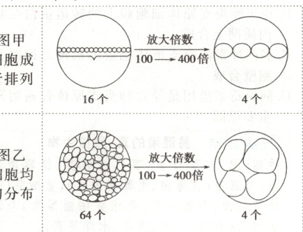 (2)若视野中细胞均匀分布在整个视野,可根据看到的细胞数目与放大倍数的平方成反比的规律进行计算(如图乙)。例如在显微镜放大倍数为 40 倍时看到 m 个均匀分布的细胞,放大倍数为 400 倍时看到的细胞数目 = m÷(400/40)² = m/100(个)。
