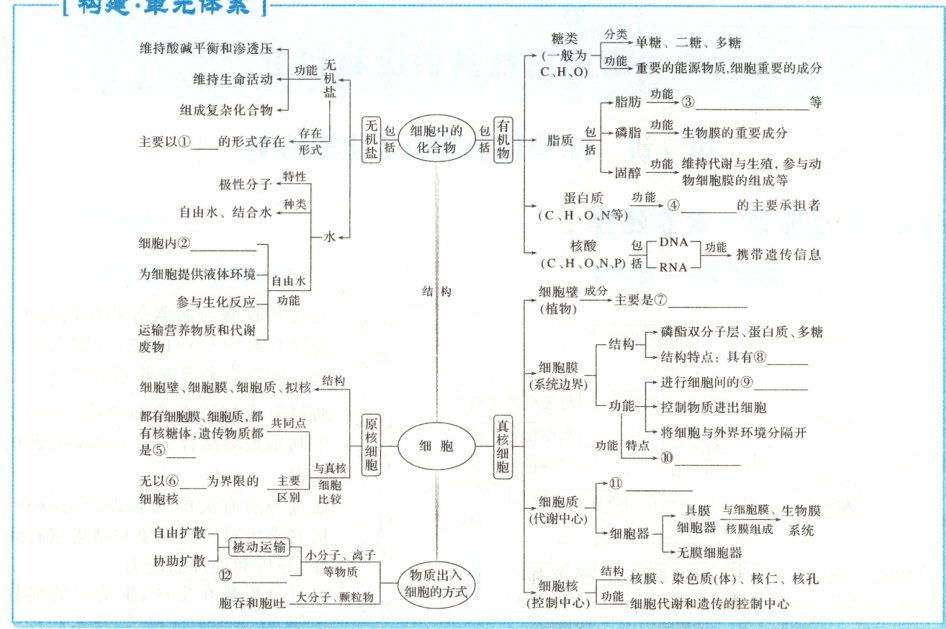 ①离子 ②含量最多的化合物 ③良好的储能物质(或储能) ④生命活动 ⑤DNA ⑥核膜 ⑦纤维素和果胶 ⑧一定的流动性 ⑨信息交流 ⑩选择透过性 ⑪细胞质基质和细胞器