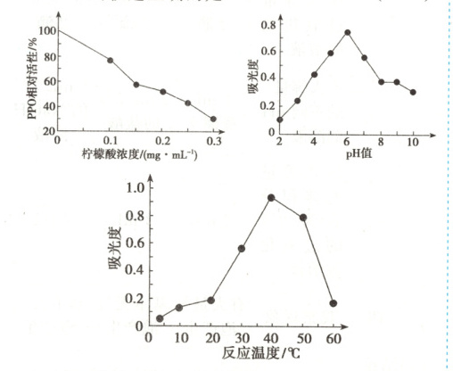 3. (2025·八省联考四川卷,9)生菜是一种在保存和运输过程中易发生褐变的蔬菜。多酚氧化酶(PPO)在有氧条件下能催化酚类物质形成褐色的醌类物质,导致植物组织褐变。某团队研究生菜多酚氧化酶在不同条件下的特性,结果如图所示。下列叙述正确的是(