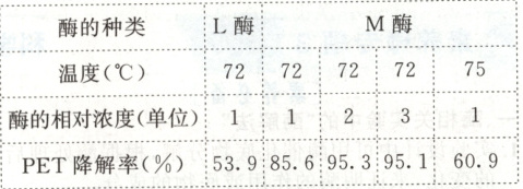4. (2025·安徽省直辖县级单位高三开学考试)自然界中的L酶能破坏塑料PET中的化学键,利于PET的降解、回收和再利用。研究人员对L酶进行改造,获得了一种M酶。研究人员测定L酶与M酶在不同条件下的催化活性如表所示。下列叙述不正确的是(