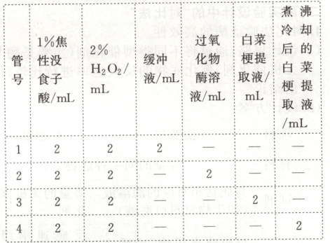 5. (2025·海南省直辖县级单位高三开学考试)过氧化物酶能分解$H_2O_2$,氧化焦性没食子酸呈橙红色,为探究白菜梗中是否存在过氧化物酶,设计实验如下表。下列相关叙述正确的是(