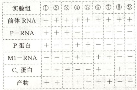 2. (2025·黑龙江大庆高三月考)某种酶由RNA和蛋白质组成,可催化某前体RNA转化为相应产物。不同细菌内该酶的组成不同,大肠杆菌内该酶由M1—RNA和$C_5$蛋白质组成,枯草芽孢杆菌内该酶由P—RNA和P蛋白组成。为探究该酶不同组分的催化功能,研究人员用以上材料进行了相关实验,结果如下表所示(表中“+”表示有,“—”表示无)。下列关于该实验的分析,错误的是(