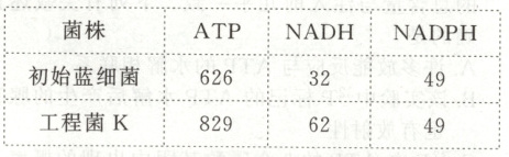 作用产生ATP,无法为Ldh提供充足的NADH。(3)蓝细菌还存在一种只产生ATP不参与水光解的光合作用途径。研究者构建了该途径被强化的工程菌K,以补充ATP产量,使更多NADH用于生成D—乳酸。测定初始蓝细菌、工程菌K中细胞质ATP、NADH和NADPH含量,结果如下表。