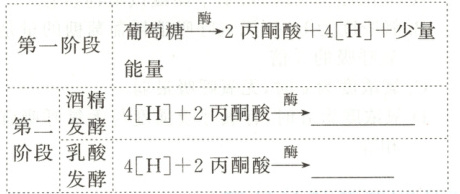 ②$C_{6}H_{12}O_{6}\xrightarrow{酶}2C_{3}H_{6}O_{3}+$少量能量