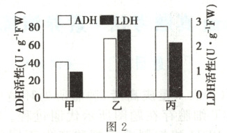1. (2025·四川内江模拟)乙醇脱氢酶(ADH)和乳酸脱氢酶(LDH)是植物细胞中无氧呼吸的关键酶,其催化的代谢途径如图 1 所示。为探究$Ca^{2+}$对淹水处理的植物根细胞呼吸作用的影响,研究人员将辣椒幼苗均分为 3 组:甲组(未淹水)、乙组(淹水)和丙组(淹水$+Ca^{2+}$),在其他条件相同且适宜的条件下进行实验,结果如图 2 所示。下列叙述正确的是(
