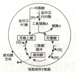 [例](2024·重庆高考)肿瘤所处环境中的细胞毒性 T 细胞存在题图所示代谢过程。其中,PC 酶和 PDH 酶控制着丙酮酸产生不同的代谢产物,进入有氧呼吸三羧酸循环。增加 PC 酶的活性会增加琥珀酸的释放,琥珀酸与受体结合可增强细胞毒性 T 细胞的杀伤能力,若环境中存在乳酸,PC 酶的活性会被抑制。下列叙述正确的是(