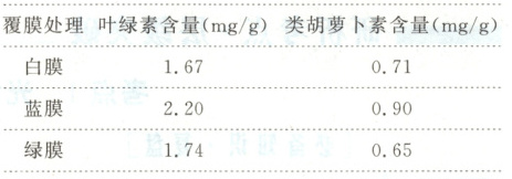 3. (2024·河北高考)高原地区蓝光和紫外光较强,常采用覆膜措施辅助林木育苗。为探究不同颜色覆膜对藏川杨幼苗生长的影响,研究者检测了白膜、蓝膜和绿膜对不同光的透过率,以及覆膜后幼苗光合色素的含量,结果如图、表所示。