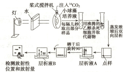 ①卡尔文等用$^{14}CO_{2}$处理小球藻不同时间,随后用沸腾的乙醇杀死细胞,目的是