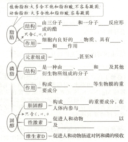 (注:因未获取到图片中具体答题空位置,无法精准填入。若图片中脂肪相关空依次为组成单位、功能,则为:脂肪由
