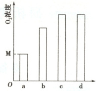 4. (2024·新课标卷)某同学将一种高等植物幼苗分为 4 组(a、b、c、d),分别置于密闭装置中照光培养,a、b、c、d 组的光照强度依次增大,实验过程中温度保持恒定。一段时间(t)后测定装置内 O₂ 浓度,结果如图所示,其中 M 为初始 O₂ 浓度,c、d 组 O₂ 浓度相同。回答下列问题。