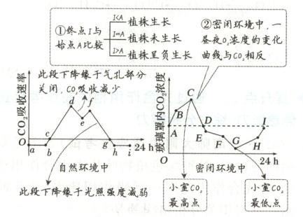 原因是密闭环境中由于有光时植株进行光合作用,吸收$CO_2$,经过一昼夜,密闭环境内$CO_2$浓度降低,而自然环境中一昼夜后$CO_2$浓度不变,因此当日开始进行光合作用的$CO_2$起始浓度,密闭环境高于自然环境。
