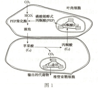 (1)有一些植物(${C_{4}}$植物)具有图 1 所示的${CO_{2}}$浓缩机制,在叶肉细胞中,磷酸烯醇式丙酮酸羧化酶($PEPC$)可将${HCO_{3}^{-}}$转化为有机物,该有机物经过一系列的变化,最终进入相邻的维管束鞘细胞释放${CO_{2}}$,提高了${Rubisco}$附近的${CO_{2}}$浓度,已知$PEP$与无机碳的结合力远大于${RuBP(C_{5})}$。