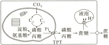 1. (2025·山东烟台调研)如图为光合作用暗反应的产物磷酸丙糖的代谢途径,研究表明,磷酸丙糖转移蛋白($TPT$)的活性是限制光合速率大小的重要因素,${CO_{2}}$充足时,$TPT$活性降低。下列有关叙述错误的是(