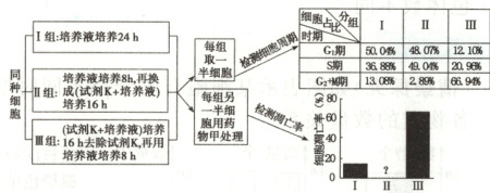 - B选项:Ⅲ组先经过试剂$K$处理,再用培养液培养$8h$后,$G_{2}+M$期细胞比例明显下降,说明试剂$K$对细胞周期的阻滞作用可逆,B错误。