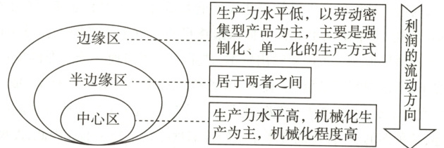 材料 美国社会学家伊曼纽尔·沃勒斯坦认为:15世纪末16世纪初以来,一个以世界范围内劳动分工为基础的资本主义世界经济体系逐渐形成(如下图所示)。其中,中心区域是经济核心区,处于全球分工价值链条的上端;外围区域(半边缘、边缘地区)是经济边缘区,处于全球分工价值链条末端。