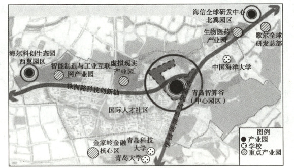 2023年2月23日,青岛市人工智能产业园(青岛智算谷)正式开园,占地面积约3000亩(1亩≈666.67m²)。当日,规划算力100P的青岛人工智能计算中心正式上线,众多企业和科研中心加入生态圈。结合园区规划,青岛市已经预留出超过600P的算力规模,青岛智算谷成为长江以北“双算力”第一园。下图为青岛智算谷区域位置图。据此完成4—5题。