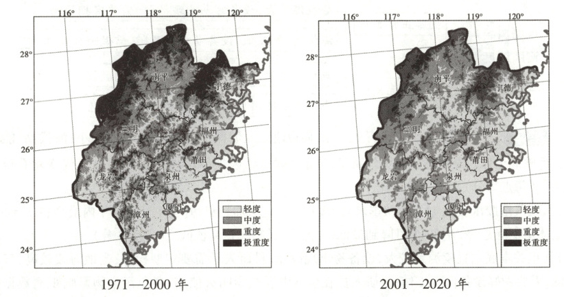 材料二 枇杷主要生长在亚热带地区,在生长发育的不同阶段,其不同器官对温度的敏感性各异,花蕾一般只能忍受-3℃以上的低温,而幼果在气温降至-1℃时即开始受冻,花果期集中在冬季。下图为1971—2000年、2001—2020年福建省枇杷种植冻害危险性等级空间分布示意图。
