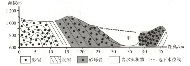 (1)有人建议将玛纳斯地下水库选址在甲处,请从地形和地质条件的角度说明原因。(8分)