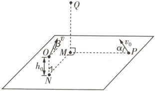 试题调研原创 某飞碟射击队在进行模拟训练时用如图所示的装置进行训练,射击过程的示意图如图所示,运动员用弹弓射出的弹丸射击飞碟,某次飞碟从地面上的$P$点以大小为$v_{0}=25\ m/s$、方向与地面成$\alpha = 53^{\circ}$的初速度斜向上射出,运动员立即从距离地面$N$点高度为$h_{0}=1.45\ m$的$O$点用弹弓将弹丸以某一初速度$v$(未知)斜向上射出,弹丸恰好在地面上$M$点正上方的$Q$点水平击中飞碟,已知$P$、$N$、$M$三点处于同一水平面内,$N$、$M$的连线与$P$、$M$的连线垂直,$M$、$P$两点间的距离为$x_{1}=30\ m$,$M$、$N$两点间的距离为$x_{2}=40\ m$,不计人的反应时间、抛靶装置的高度及弹丸在弹弓中的运动时间,且忽略空气阻力及靶的大小,取重力加速度为$g = 10\ m/s^{2}$,$\sin53^{\circ}=0.8$,则下列说法正确的是