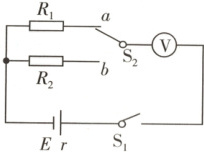 ②第二次测量:闭合开关 $ S_1 $,将开关拨至位置 $ b $,电压表与 $ R_2 $ 串联接在电池两端,记录电压表示数 $ U_2 $。
