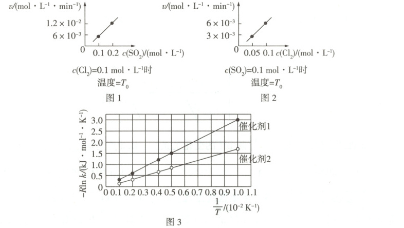 $SO_2$和$Cl_2$发生反应$SO_2(g)+Cl_2(g)\rightleftharpoons SO_2Cl_2(g)\quad \Delta H < 0$,该反应的速率方程可表示为$v = k· c^m(SO_2)· c^n(Cl_2)$,$k$为速率常数。已知$R\ln k = -\frac{E_{a}}{T}+C$($R$、$C$为常数),通过实验获得图1、图2。下列说法错误的是
