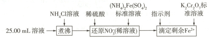 “煮沸”时${NH^{+}_{4}}$和${NO^{-}_{2}}$转化为${N_{2}}$;“还原${NO^{-}_{3}}$”时加入$10\ {mL}\ 0.100\ 0\ {mol· L^{-1}}$${(NH_{4})_{2}Fe(SO_{4})_{2}}$标准溶液,“滴定剩余${Fe^{2+}}$”时消耗$V\ {mL}\ 0.100\ 0\ {mol· L^{-1}}\ {K_{2}Cr_{2}O_{7}}$标准溶液,则样品中${Ca(NO_{3})_{2}}$的质量分数为