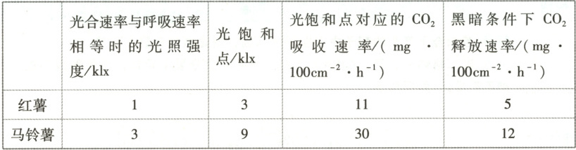 试题调研原创(多选)在${CO_{2}}$浓度一定(该浓度为红薯最适${CO_{2}}$浓度)、环境温度为${30^{\circ}C}$条件下,测定马铃薯和红薯的相关指标,结果如表,已知红薯细胞呼吸的最适温度为${30^{\circ}C}$,光合作用最适温度为${25^{\circ}C}$。下列叙述正确的是