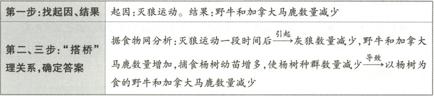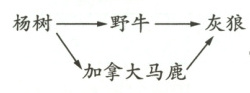 黄石公园中有杨树(公园中的主要树种)、加拿大马鹿(主要取食杨树幼苗)和灰狼(捕食野牛和加拿大马鹿)等生物。20 世纪初,黄石公园开展了灭狼运动,使得原本生活在灰狼捕食阴影下的加拿大马鹿种群数量迅速增长,但是灭狼一段时间后,公园的生态状况恶化,杨树种群退化,原本生活在杨树林群落里的多种生物的生存受到威胁,如野牛(以杨树叶为食)和加拿大马鹿等。20 世纪末,灰狼又重新被引入黄石公园。