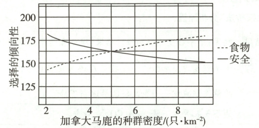 (3)科学家推测动物可能会根据不同条件,在食物和生存风险二者之间进行权衡选择栖息地,科研人员调查了加拿大马鹿种群密度和栖息地选择之间的关系,结果如图所示: