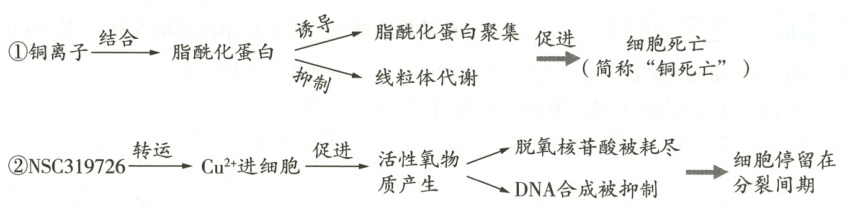 调研2 试题调研原创 机体细胞内的铜离子可参与多种生理反应,过量的铜能引发细胞死亡(简称“铜死亡”),其机制为:铜离子通过与脂酰化蛋白结合,诱导脂酰化蛋白的聚集,同时抑制线粒体代谢功能,从而促进细胞发生铜死亡。进一步研究发现,细胞膜上的铜离子载体 NSC319726 可转运 Cu²⁺进入细胞并促进活性氧物质产生,导致脱氧核苷酸被耗尽和 DNA 合成被抑制,使细胞停留在分裂间期。下列叙述错误的是