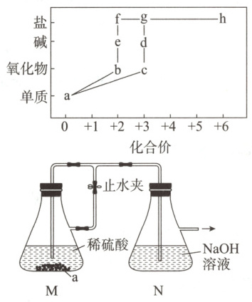 5.B 详解:由图可知,该金属元素的化合价有0价、+2价、+3价和+6价,故该元素为Fe,因此a为Fe,b为FeO,c为Fe₂O₃,d为氢氧化铁,e为氢氧化亚铁,f为亚铁盐,g为铁盐,h为高铁酸盐。a→f→g→h的每一步转化,铁的化合价均在升高,铁元素被氧化,故均需要加入氧化剂,A正确;b为FeO,化学性质不稳定,在空气中受热能迅速被氧化成Fe₃O₄,B错误;c→a的转化中铁元素的化合价降低,Fe₂O₃作氧化剂,可通过在一定条件下加入CO、Al等还原剂实现,C正确;按上图实验装置,打开止水夹,铁与稀硫酸反应生成的氢气将装置内的空气排出,关闭止水夹,生成的氢气使M中气压升高,将硫酸亚铁溶液压入N中,与NaOH反应可制备Fe(OH)₂,由于隔绝空气,能较长时间保持白色沉淀不变色,D正确。