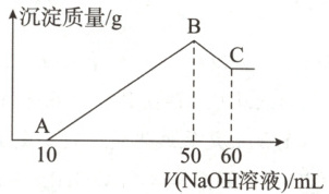 4.A 详解:由题图可知,从开始至加入$\mathrm{NaOH}$溶液$10\mathrm{mL}$,没有沉淀生成,说明原溶液中盐酸有剩余,此时发生的反应为$\mathrm{HCl}+\mathrm{NaOH}=\mathrm{NaCl}+\mathrm{H}_2\mathrm{O}$;继续滴加$\mathrm{NaOH}$溶液至$50\mathrm{mL}$时,沉淀量最大,此时沉淀为$\mathrm{Mg(OH)}_2$和$\mathrm{Al(OH)}_3$,溶液溶质为$\mathrm{NaCl}$;再继续滴加$\mathrm{NaOH}$溶液,发生反应$\mathrm{Al(OH)}_3+\mathrm{NaOH}=\mathrm{Na[Al(OH)}_4\mathrm{]}$,$\mathrm{Al(OH)}_3$溶解。加入$\mathrm{NaOH}$溶液为$50\mathrm{mL}$时,$\mathrm{AB}$段消耗$\mathrm{NaOH}$溶液$40\mathrm{mL}$,则根据元素守恒,$n(\mathrm{HCl})=n(\mathrm{NaCl})=1\mathrm{mol· L}^{-1}×0.04\mathrm{L}=0.04\mathrm{mol}$,则产生氢气的物质的量为$0.02\mathrm{mol}$,由于没有注明标准状况下,则氢气的体积无法计算,A错误;加入$\mathrm{NaOH}$溶液为$50\mathrm{mL}$时,沉淀为$\mathrm{Mg(OH)}_2$和$\mathrm{Al(OH)}_3$,溶液溶质为$\mathrm{NaCl}$,则根据元素守恒,$n(\mathrm{HCl})=n(\mathrm{NaCl})=1\mathrm{mol· L}^{-1}×0.05\mathrm{L}=0.05\mathrm{mol}$,因此盐酸的浓度为$0.5\mathrm{mol· L}^{-1}$,B正确;根据分析,滴加$\mathrm{NaOH}$溶液至$50\mathrm{mL}$时,沉淀量最大,此时沉淀为$\mathrm{Mg(OH)}_2$和$\mathrm{Al(OH)}_3$,溶液溶质为$\mathrm{NaCl}$,则所得溶液中溶质仅有一种,C正确;根据分析,A点之前未产生沉淀,则原溶液中盐酸有剩余,说明镁铝合金已经完全溶解于盐酸中,D正确。
