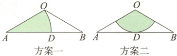 例5 如图,用两种方案将一块顶角为$120^{\circ}$,腰长为$2$的等腰三角形钢板$OAB$裁剪成扇形,设方案一、二中扇形(阴影部分)的面积分别为$S_1$,$S_2$,周长分别为$l_1$,$l_2$,则(