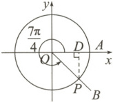 解:如图,在平面直角坐标系中作 $\angle AOB=\frac {7\pi }{4}$,其终边交单位圆于点 P,过点 P 作 PD⊥x 轴于点 D,则 $\angle POD=\frac{\pi}{4}$。