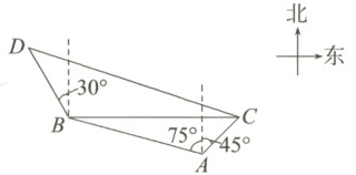 由题意,得 $BD = 10t$ 海里,$CD = 10\sqrt{3}t$ 海里,$\angle DBC = 120°$。