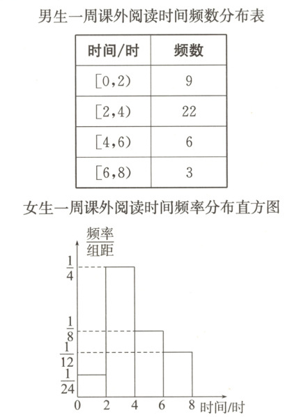 例 5 读书可以增长知识,开拓视野,修身怡情。某校为了解本校学生课外阅读情况,按性别进行分层,用分层随机抽样的方法从全校学生中抽出一个容量为 100 的样本,其中男生 40 名,女生 60 名。经调查统计,分别得到 40 名男生一周课外阅读时间(单位:时)的频数分布表和 60 名女生一周课外阅读时间(单位:时)的频率分布直方图。