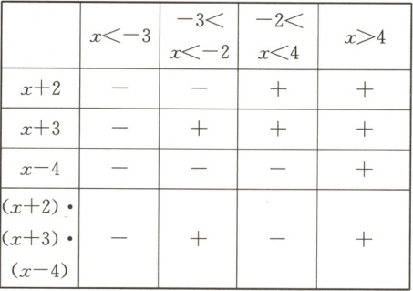 由上表可知,原不等式的解集为 $\{x|-3<x<-2$ 或 $x>4\}$。
