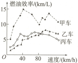 例 9 (北京卷)汽车的“燃油效率”是指汽车每消耗 1 L 汽油行驶的里程,甲、乙、丙三辆汽车在不同速度下的燃油效率情况如图所示,下列叙述正确的是(