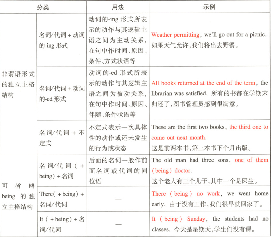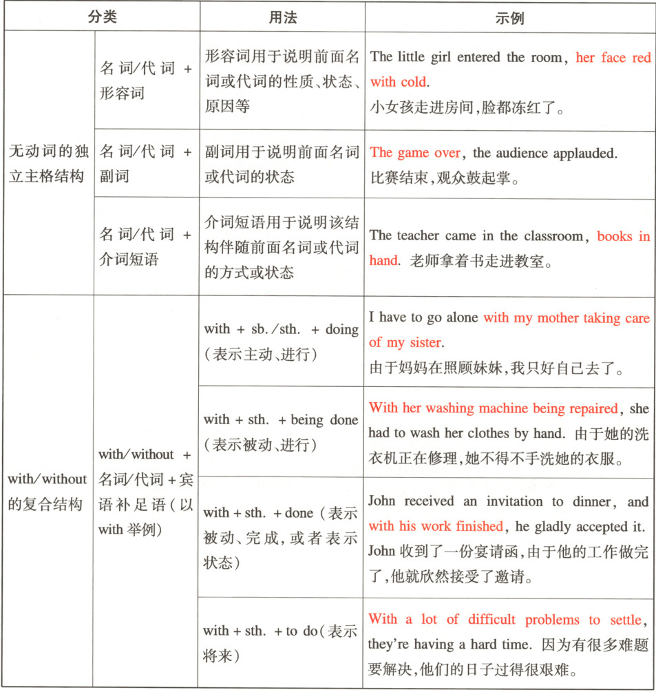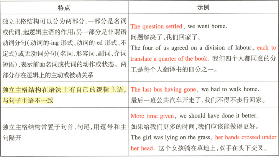 “独立主格结构”又称“独立结构”,是带有自己主语的非谓语动词分句和无动词分句。同时它还是一种从属分句,通常在句中可作时间、原因、条件、方式和伴随状语等。