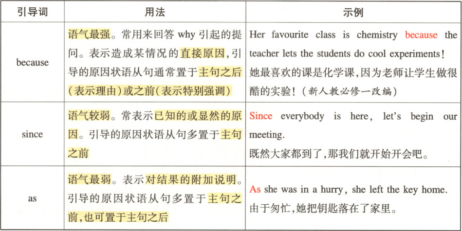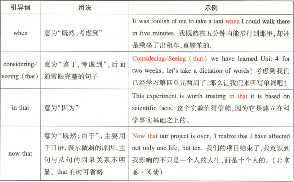 在主从复合句中作原因状语的从句称为原因状语从句。原因状语从句可置于句首,也可置于句尾。常见的引导词有 because、as、since、when、now that、in that、considering(that)、seeing(that)等。
