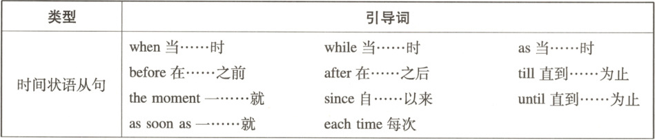 (6)表示“一……就……”的引导词有 as soon as、the moment/minute、the instant、immediately、instantly、directly 等。