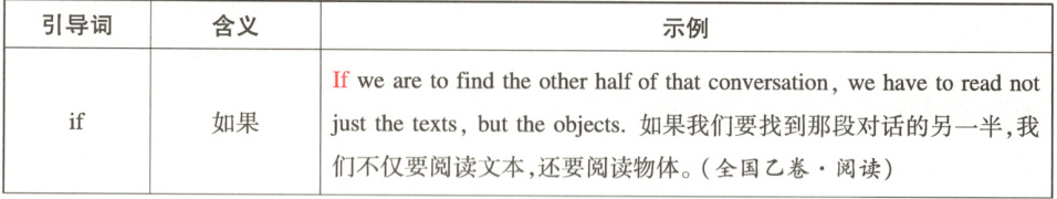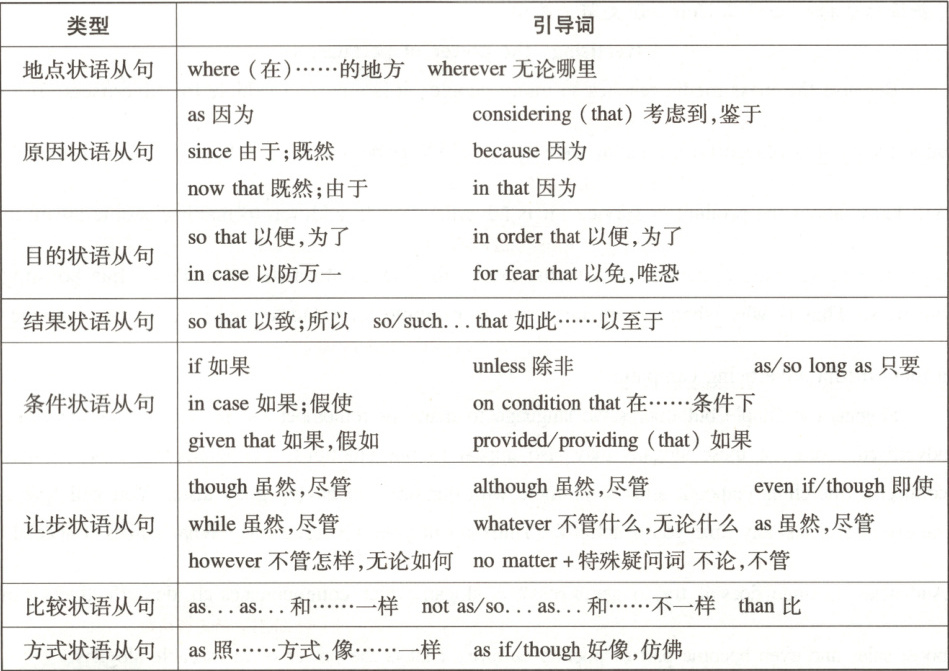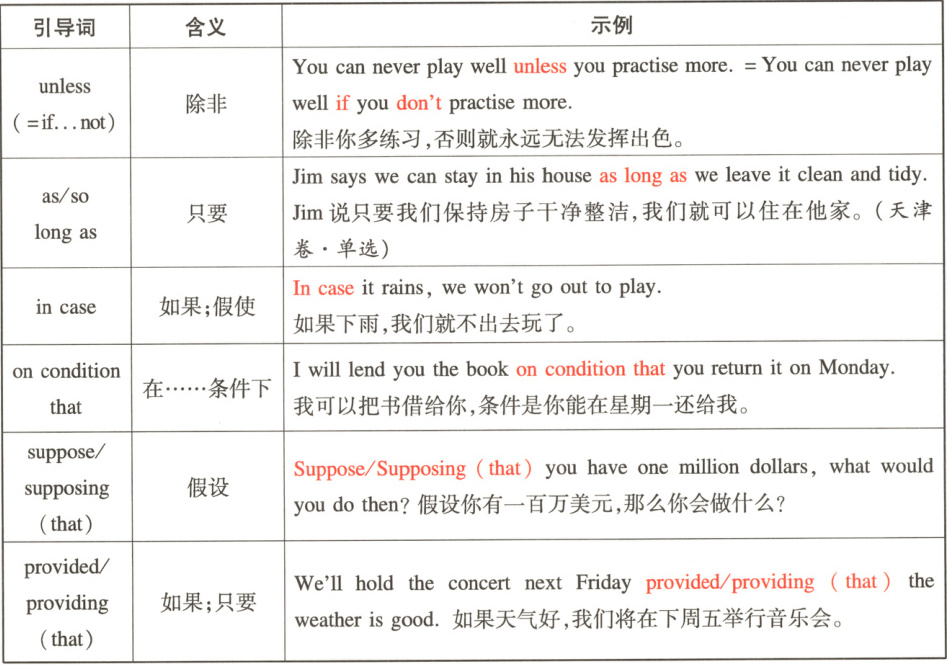 在主从复合句中作条件状语的从句称为条件状语从句。条件状语从句可置于句首,也可置于句尾,有时还可置于主语和谓语之间。常见的引导词有 if、unless(= if...not)、as/so long as、in case、on condition that、supposing(that)、provided/providing(that)等。
