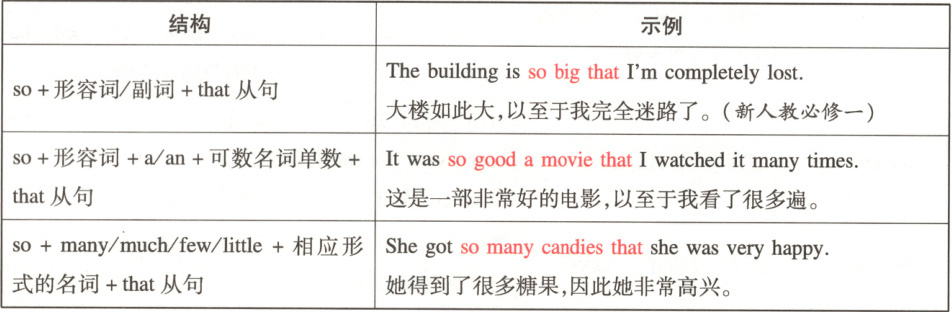 so...that...引导结果状语从句时意为“如此……以至于……”,常见结构如下: