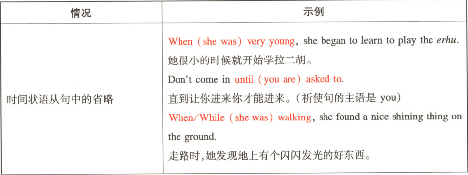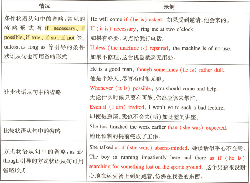 在时间、条件、让步、方式等状语从句中,为了使语言更加简洁、生动,经常运用省略形式。状语从句的省略原则:如果从句主语和主句主语一致,或从句主语为 it,且从句的谓语部分有 be 动词,就可以把从句中的主语和谓语中的 be 动词一起省略。
